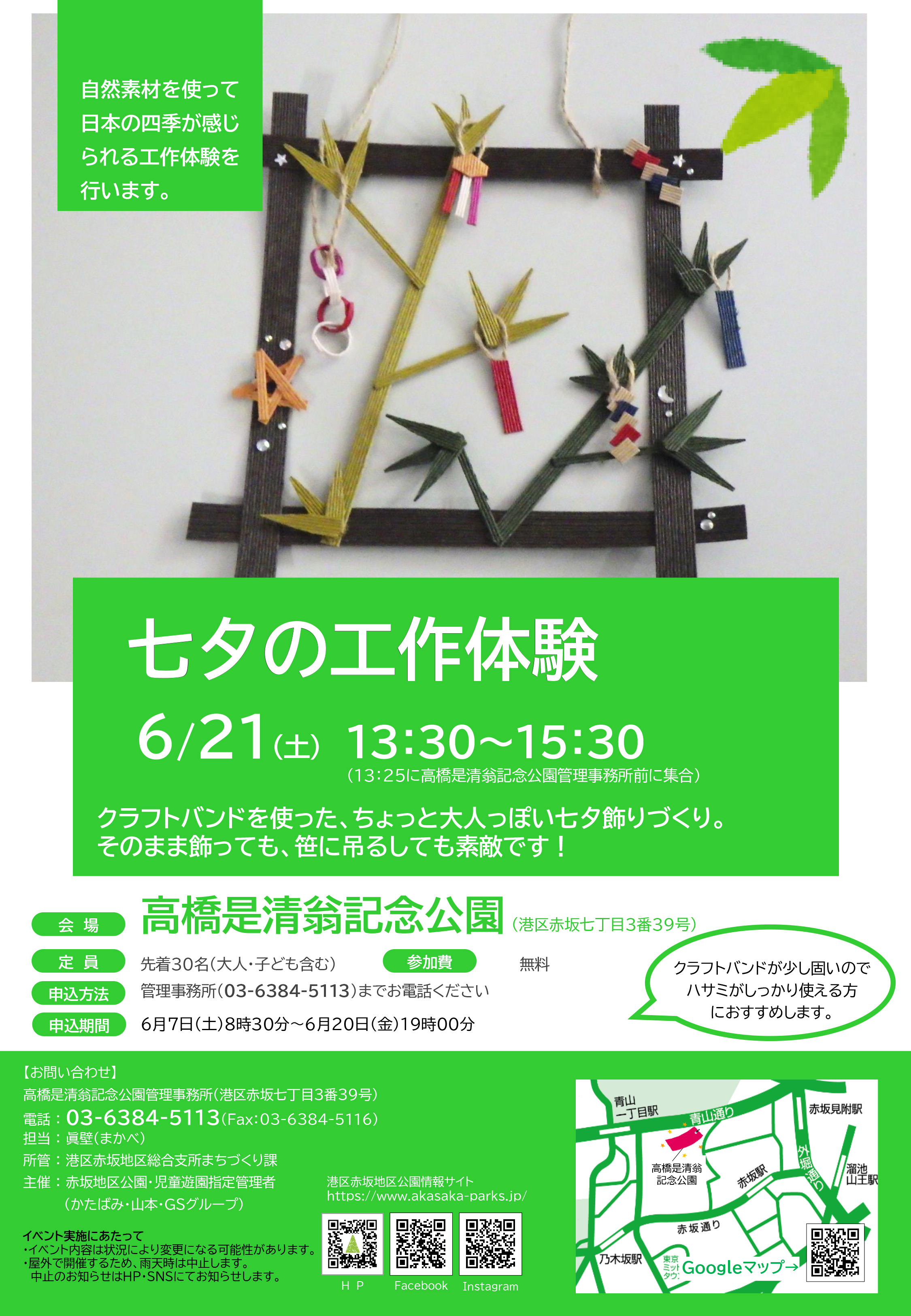 6月21日(土)13:30-15:30、高橋是清翁記念公園にて七夕の工作体験を実施いたします。