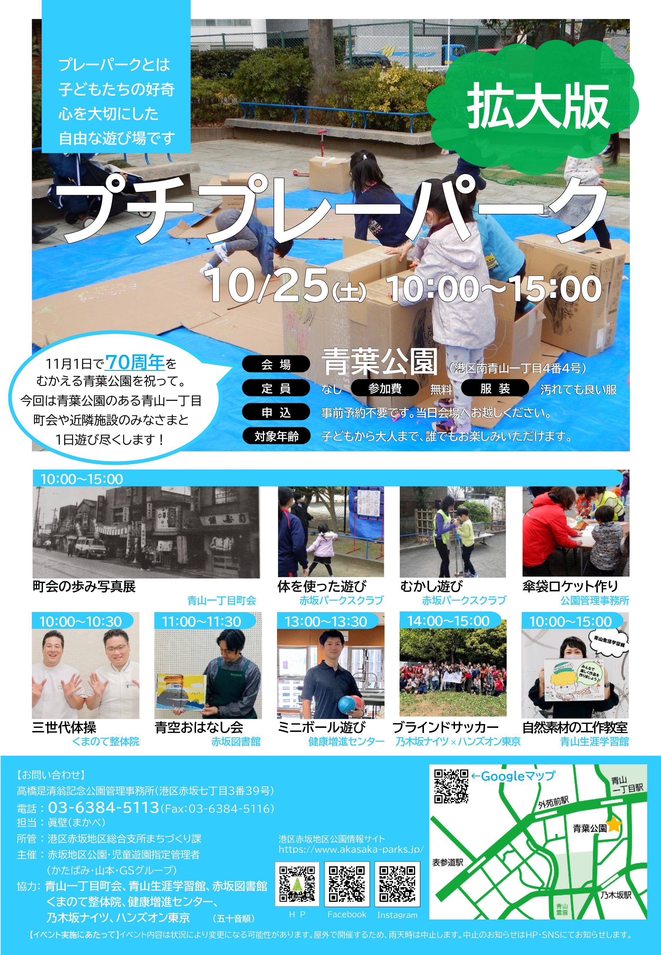 10月25日(土)10:00 - 15:00 青葉公園にてプチプレーパークを開催いたします。11月1日で70周年をむかえる青葉公園を祝って。今回は青葉公園のある青山一丁目町会や近隣施設のみなさまと1日遊び尽くします!
