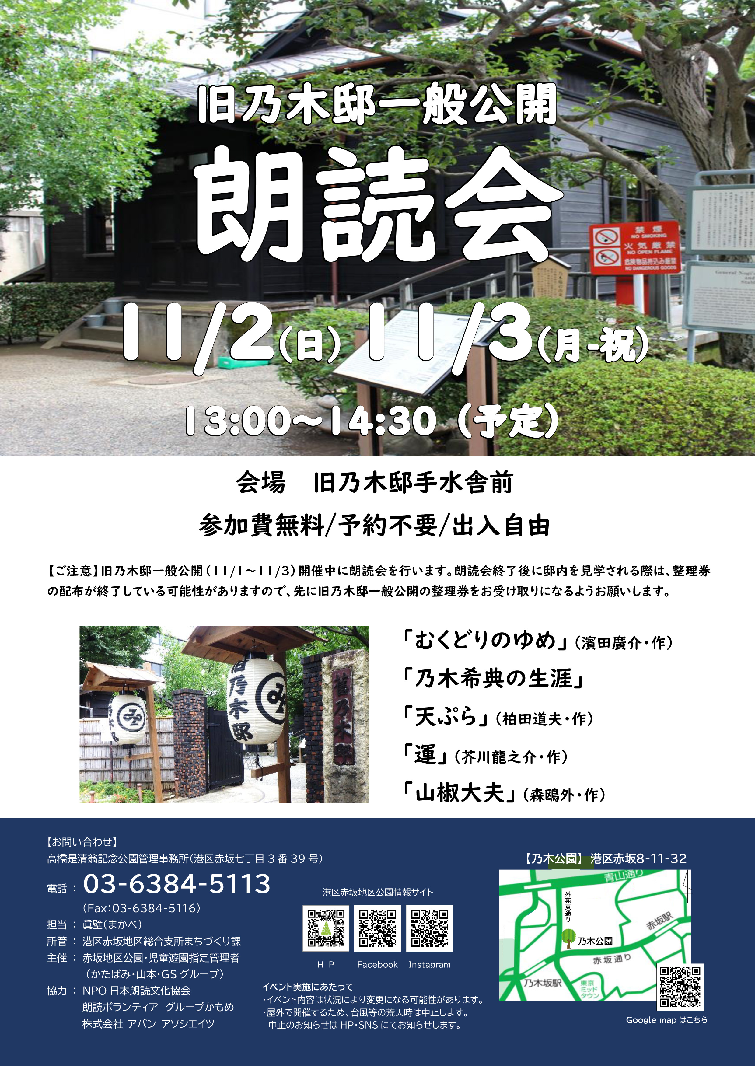 【11月2日(日)・11月3日(月・祝)】 旧乃木邸一般公開 朗読会 開催のお知らせ