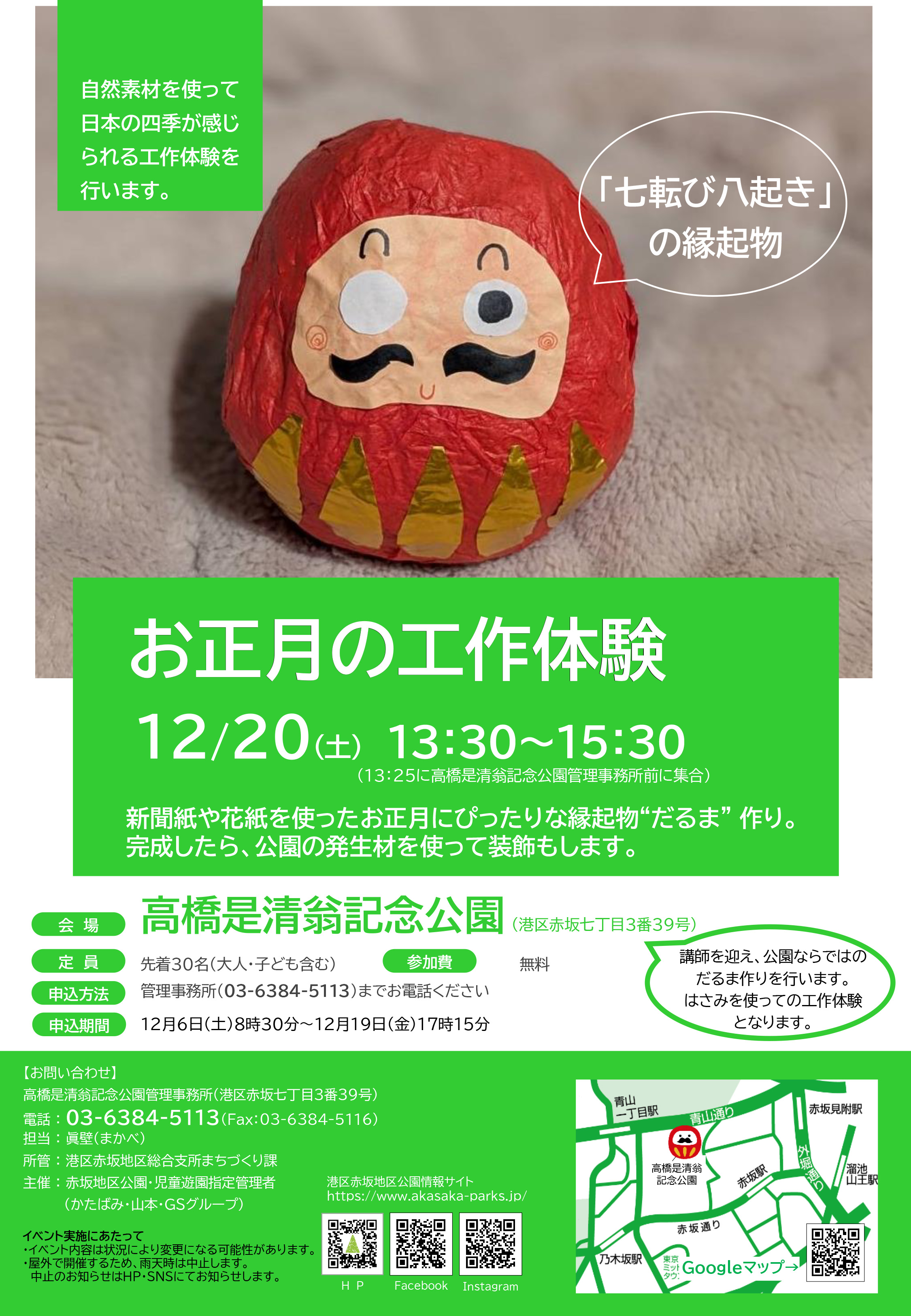 We will be held "New Year's craft experience" at the Takahashi Korekiyo-o Memorial Park on December 20th. We are look forward to seeing you.
