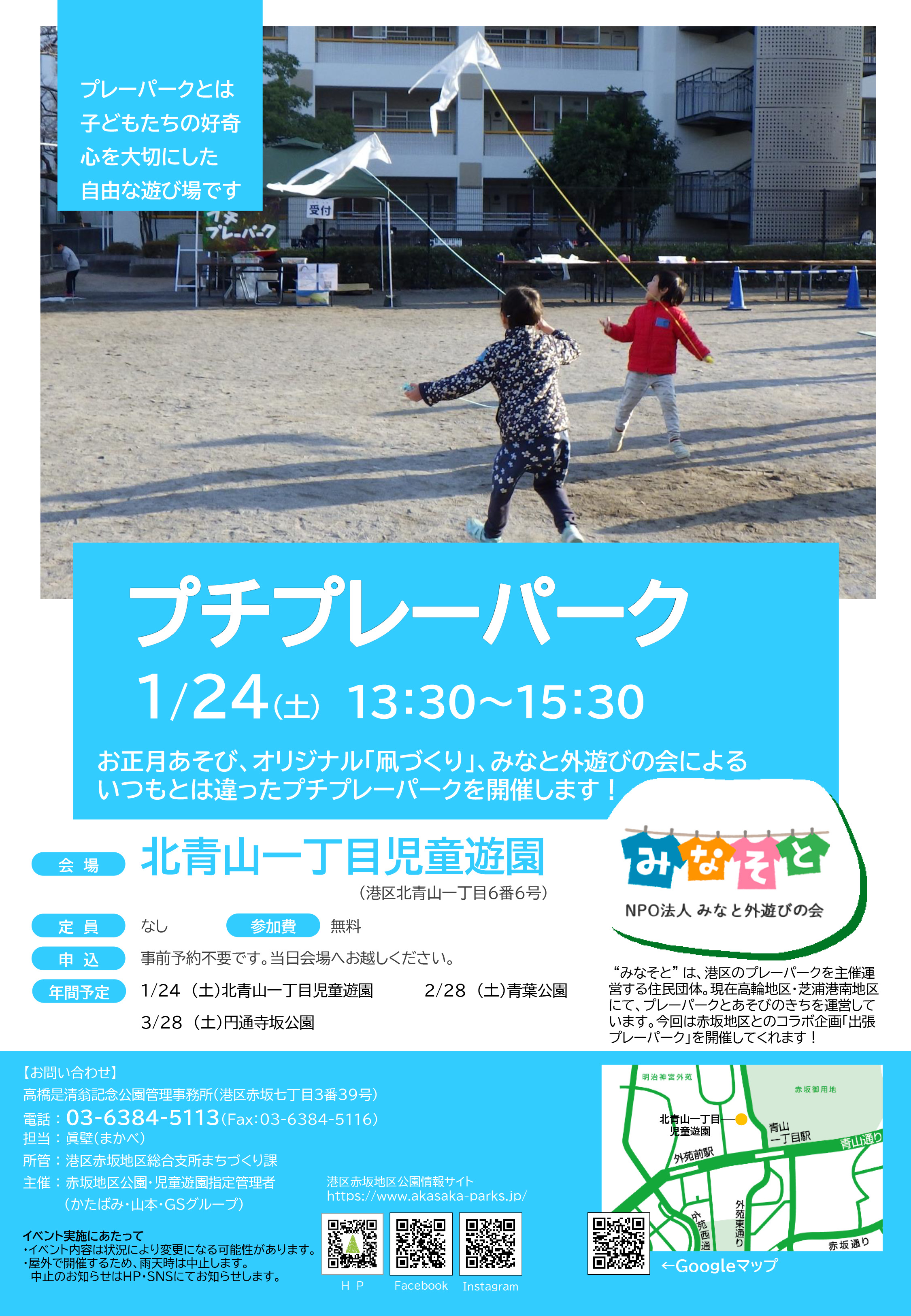 2026年最初のプチプレーパークは、北青山一丁目児童遊園にてお正月あそび、オリジナル「凧づくり」、みなと外遊びの会によるいつもとは違ったプチプレーパークを開催します!