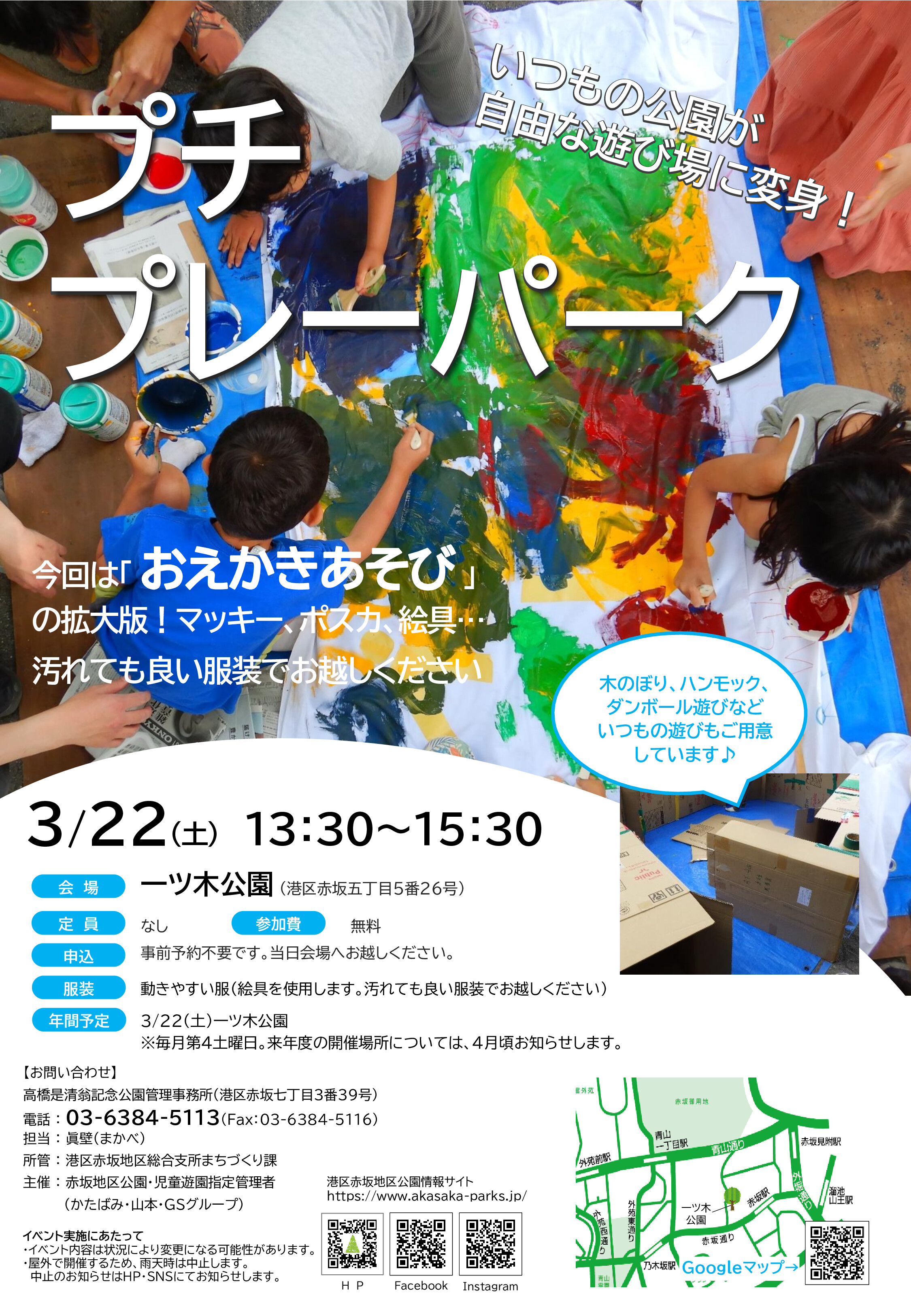 5月24日(土)13:30~15:30にプチプレーパークを開催いたします。今回は「絵具」で遊ぼう!プチプレーパークの旗(2025版)作りや、ダンボール遊びなどのいつも大好評の遊びもご用意します。体を思いきり動かして遊びましょう!汚れても良い服装でお越しください。