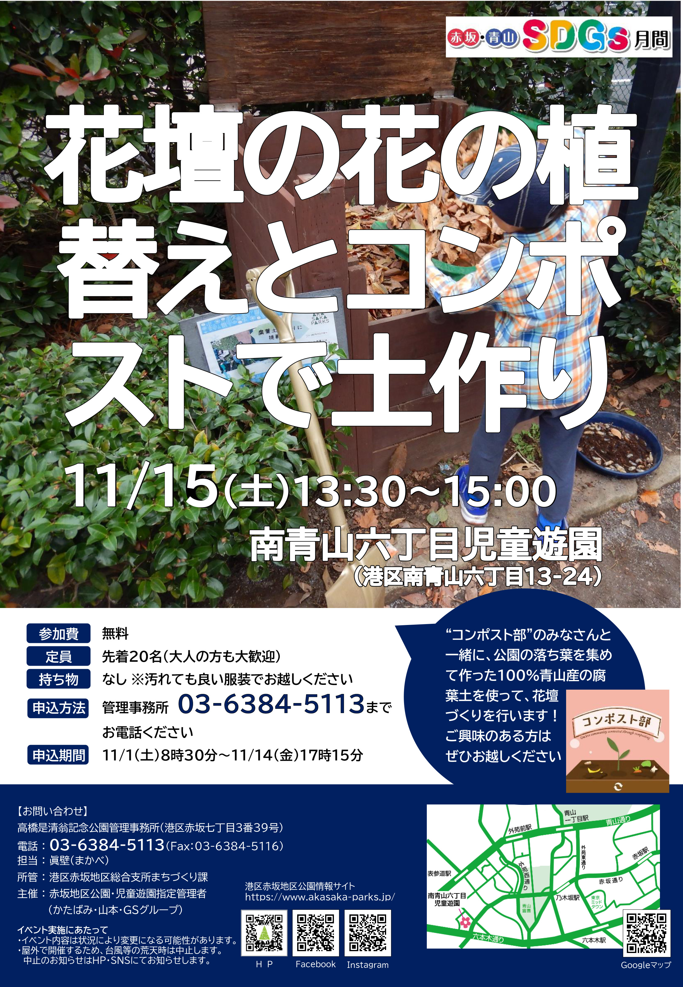 ”コンポスト部”のみなさんと一緒に、公園の落ち葉を集めて作った100%青山産の腐葉土を使って、花壇の花の植え替えを行います。ご興味のある方ぜひお越しください。